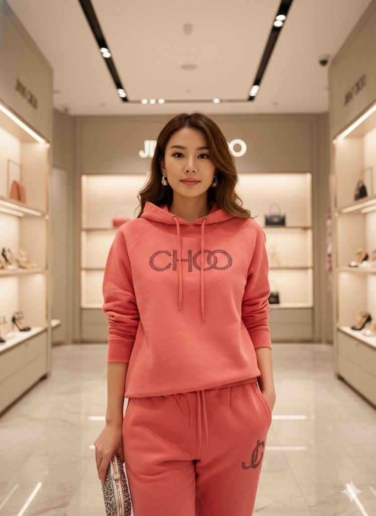 - The hoodie features a shimmering embellished brand logo design, paired with a matching crystal “J” on the joggers. The subtle sparkle gives the set a refined, fashion-forward attitude.