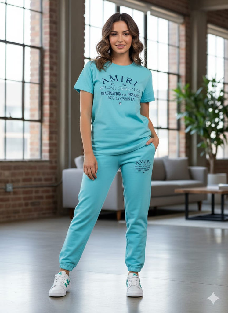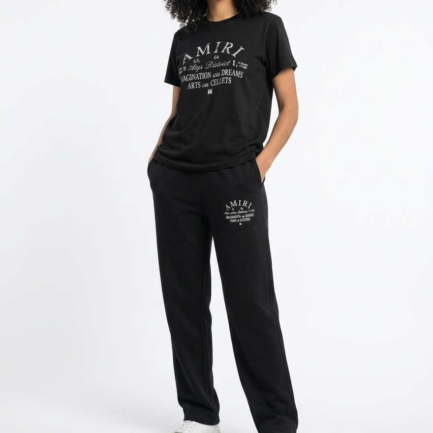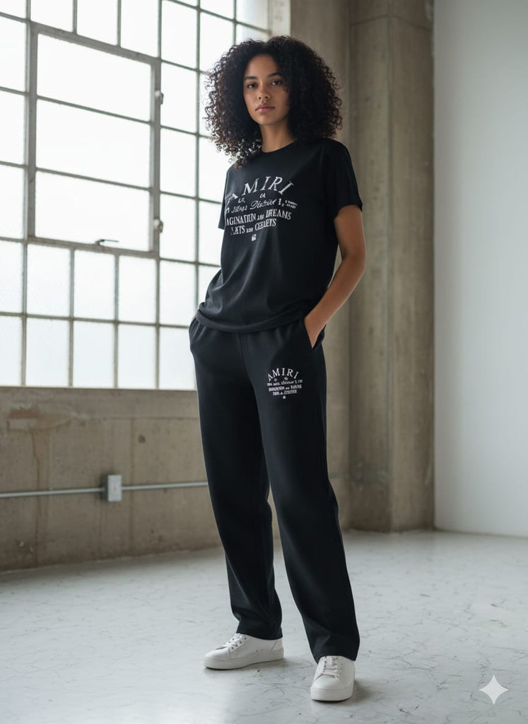 Stylish printed graphic design on both t-shirt and joggers