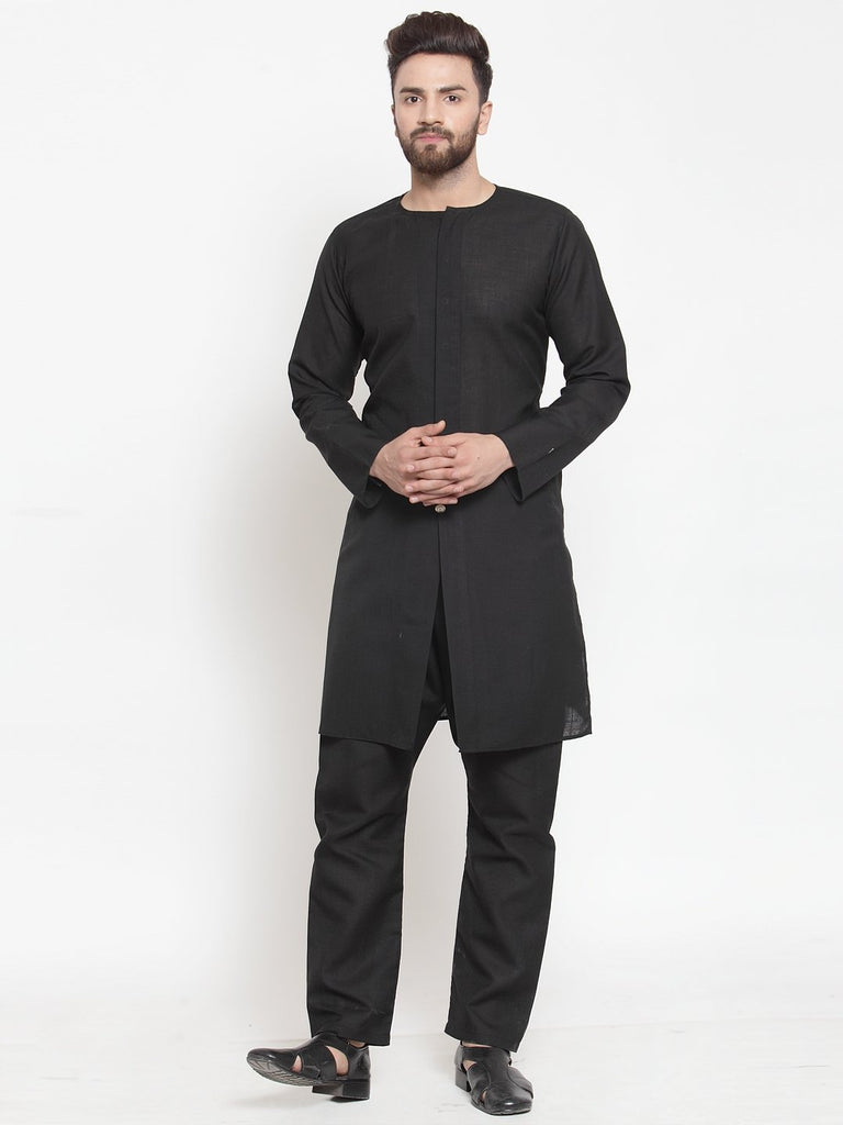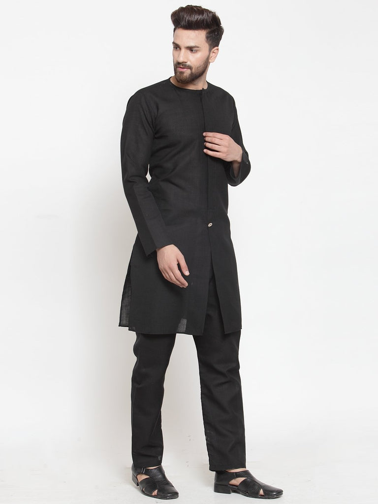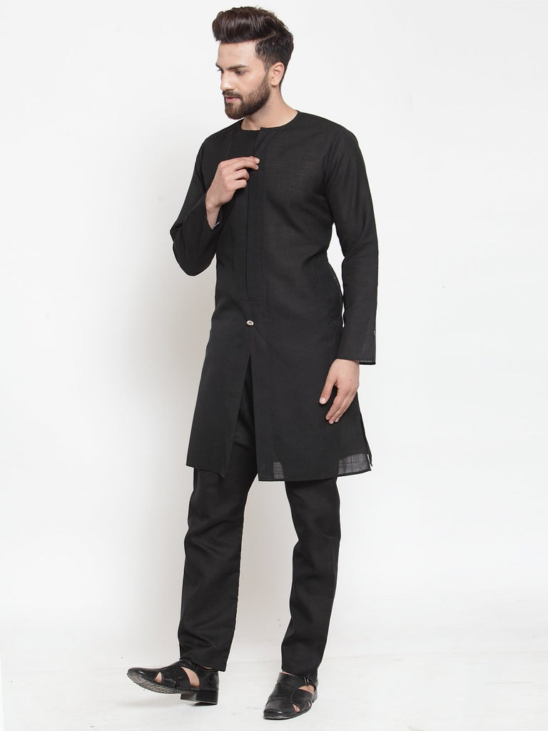 Black Kurta With Aligarh Pajama Set in Linen For Men by Luxury at Less