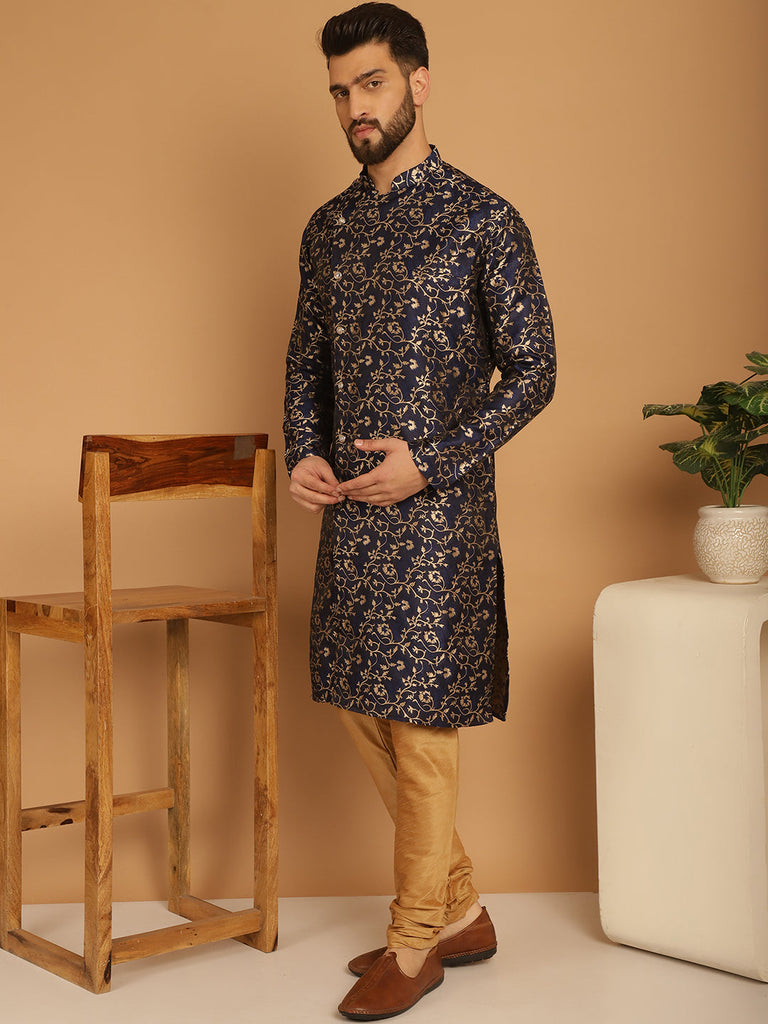Designer Blue Golden Brocade Silk Sherwani Set by Luxury at Less
