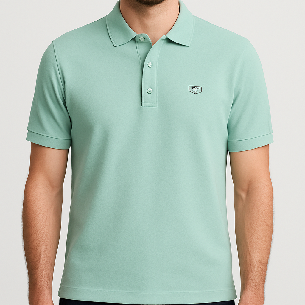 • Traditional polo collar with a two-button placket, featuring subtle yellow piping for contrast