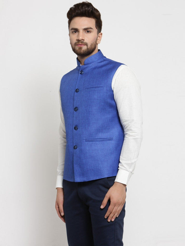 Men Blue Solid Nehru Jacket By Luxury at Less