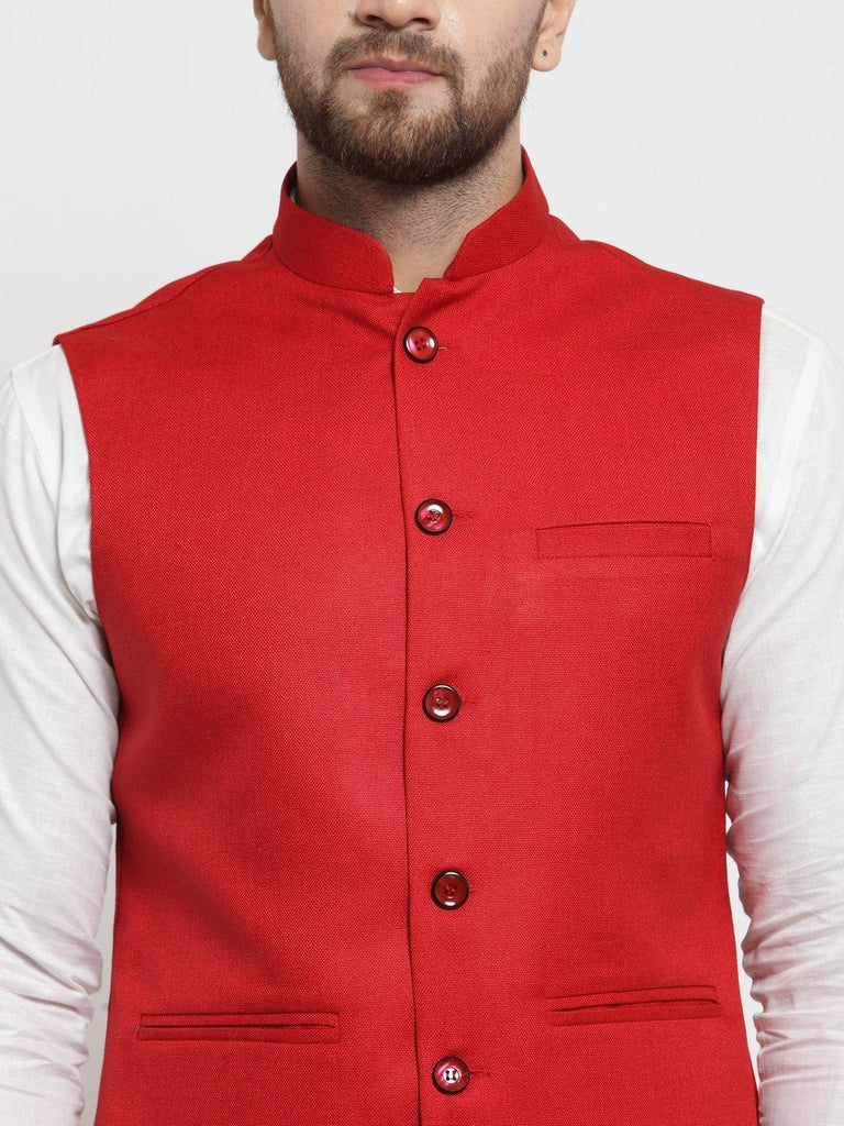 Red Nehru Jacket has a mandarin collar, a full button placket, sleeveless, three welt pockets, vented hem, an attached lining with two inner pockets.