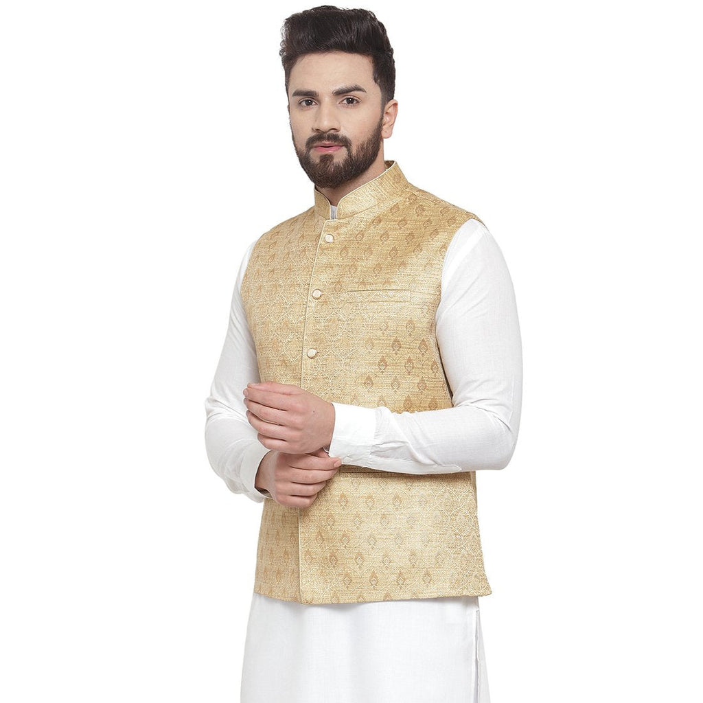 New Designer Men Golden Brocade Nehru Jacket By Luxury at Less