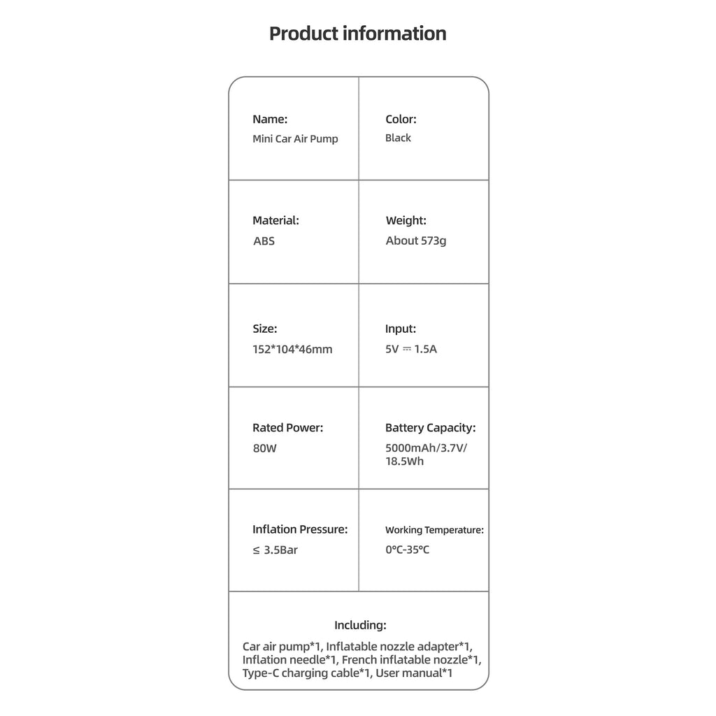 Including: car air pump*1, inflatable nozzle adapter*1, inflation needle*1, French inflatable nozzle*1, Type-C charging cable*1, user manual*1